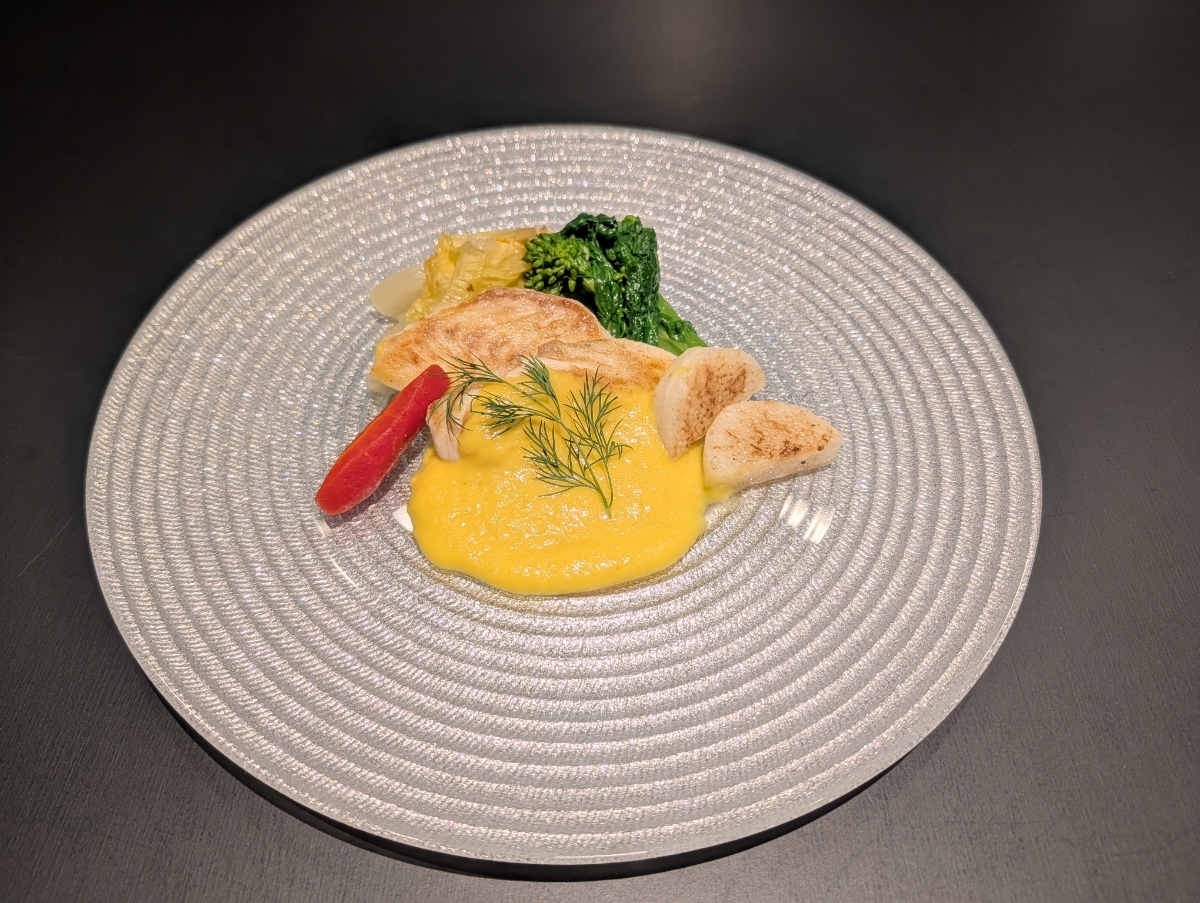 パプリカ、たまねぎ、にんにく、オリーブ油等をペースト状にし、乳化させた素材の味を活かしたソースです。新年に相応しい仕上がりの一皿です。