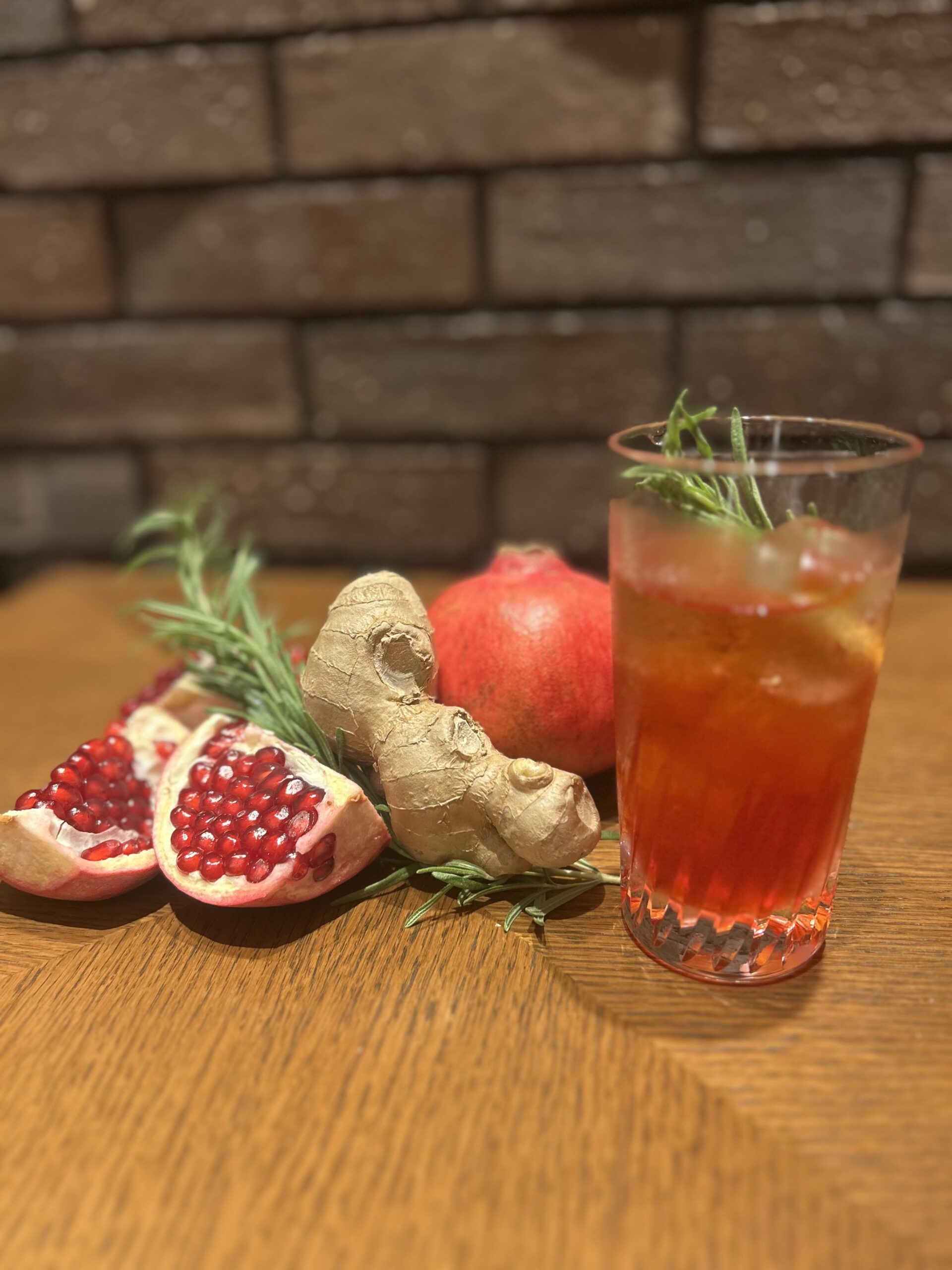 ■グレナデンソーダ秋に旬を迎えるザクロをベースとして、生姜やローズマリーなど相性のいいスパイスを漬け込んだ特製のシロップがベースのオリジナルドリンクです。甘酸っぱいザクロと、スパイスやハーブのシャープな香りをお楽しみください。